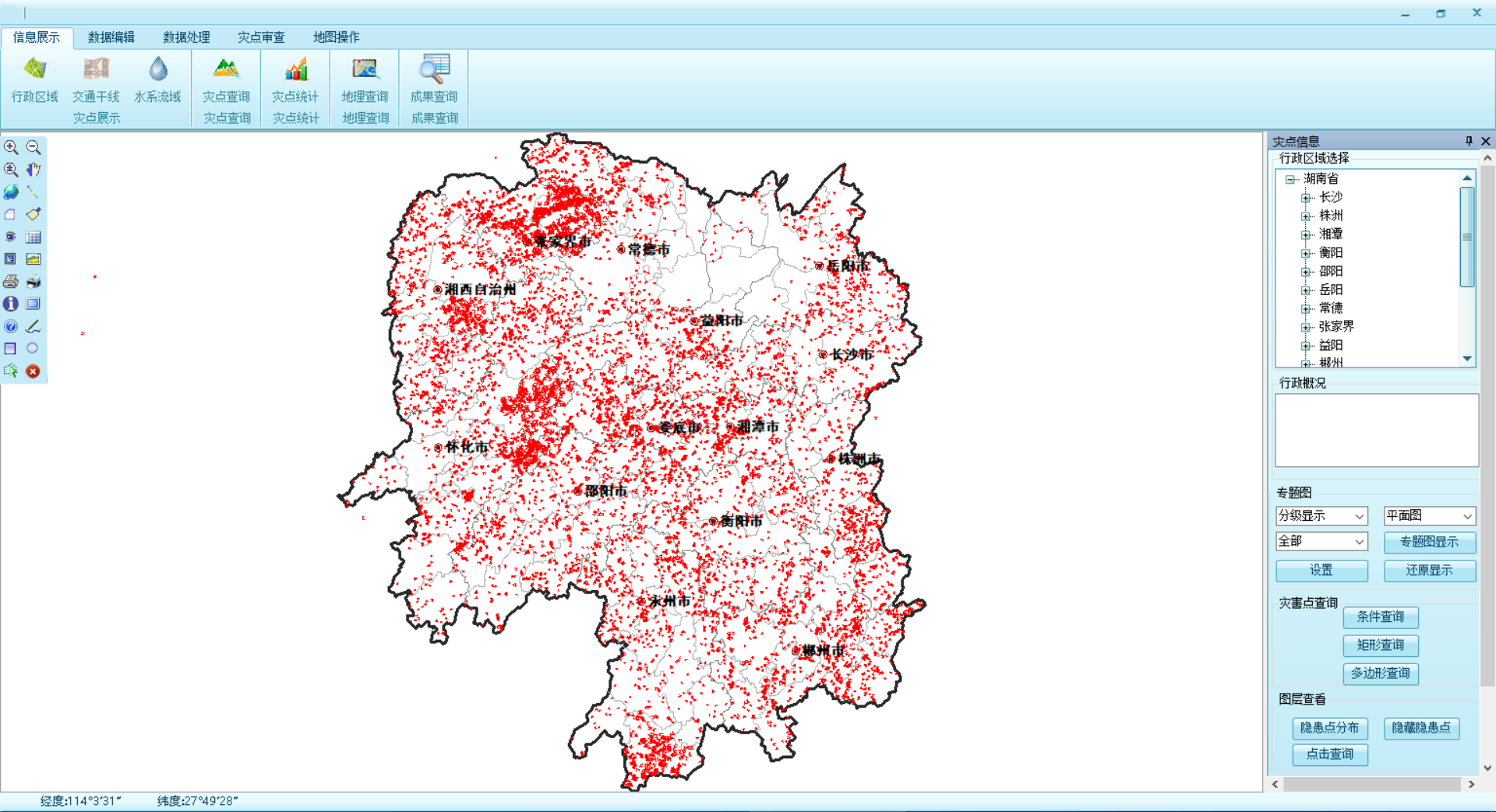湖南省地质灾害详细调查数据集成系统是在GIS(DMGIS)与SQL SERVER以及相关操作系统的架构上,采用C/S的模式平台,设计研发囊括灾点展示、灾点查询、地理查询、三维展示、数据编辑、数据转换、1:5万专题图件无缝拼接、数据检查、特征要素的集合与展示等功能在内的一体化业务系统。